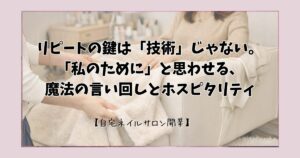 この2つを丁寧に積み重ねるだけで、口下手でも、面白いエピソードトークができなくても、”すごく丁寧で、信頼できるネイリストさん”という評価は確実に作れます。
